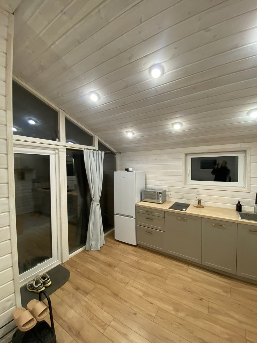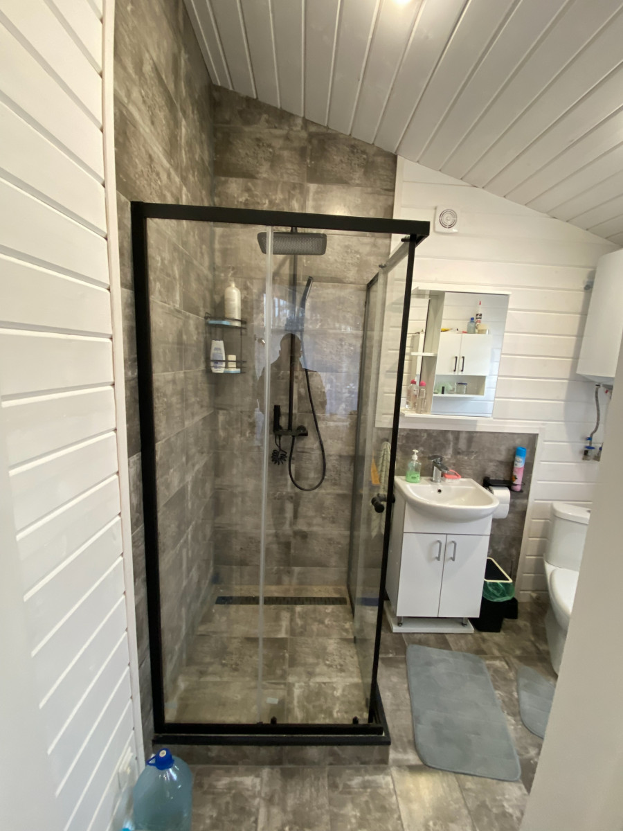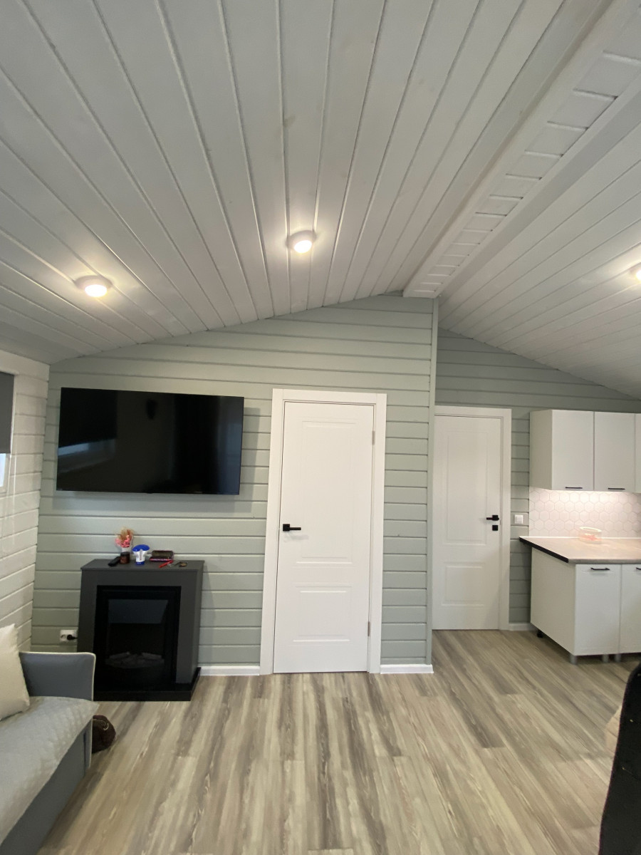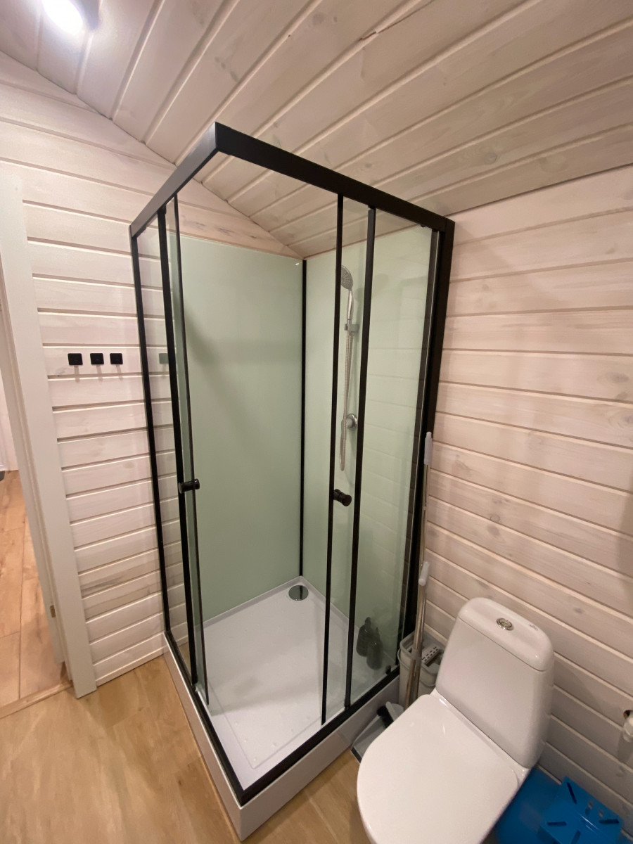 - Санузел: пол – кварцвинил, стены и потолок – имитация бруса, вентилятор с датчиком влажности