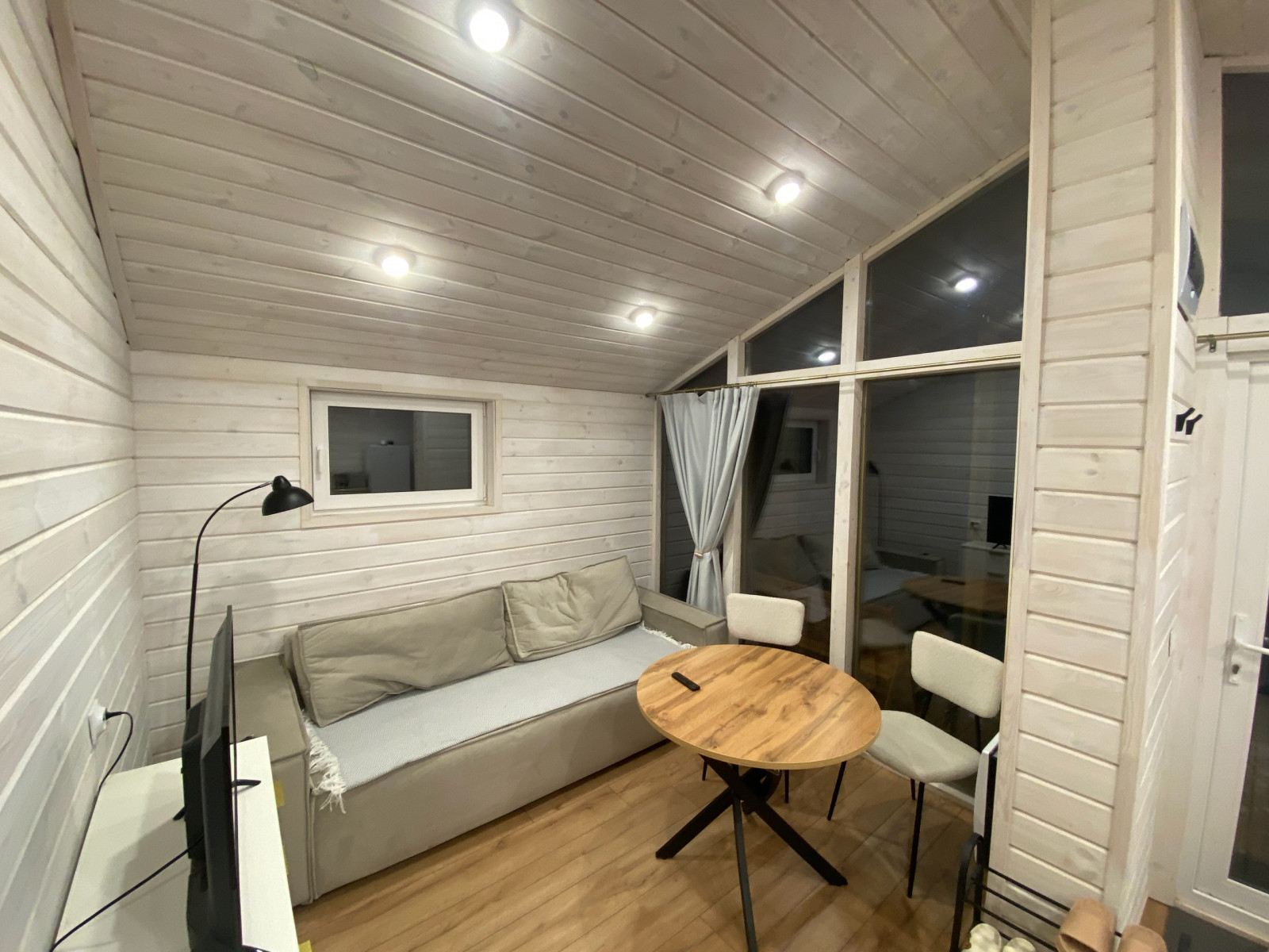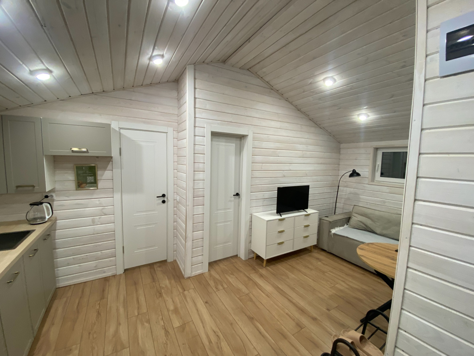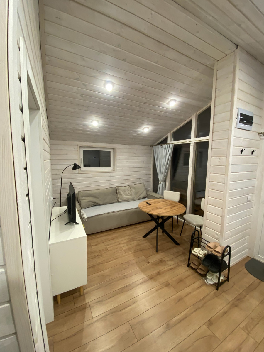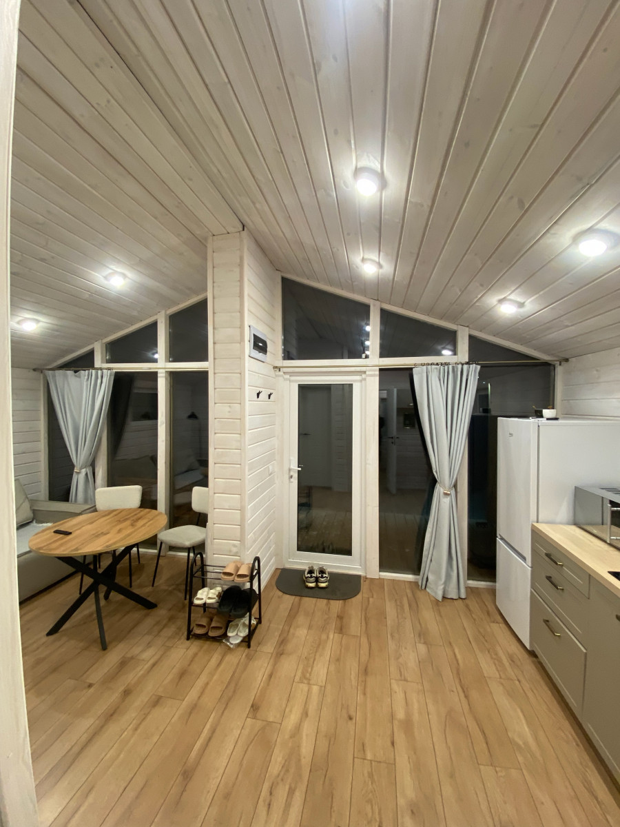- Санузел: пол – кварцвинил, стены и потолок – имитация бруса, вентилятор с датчиком влажности