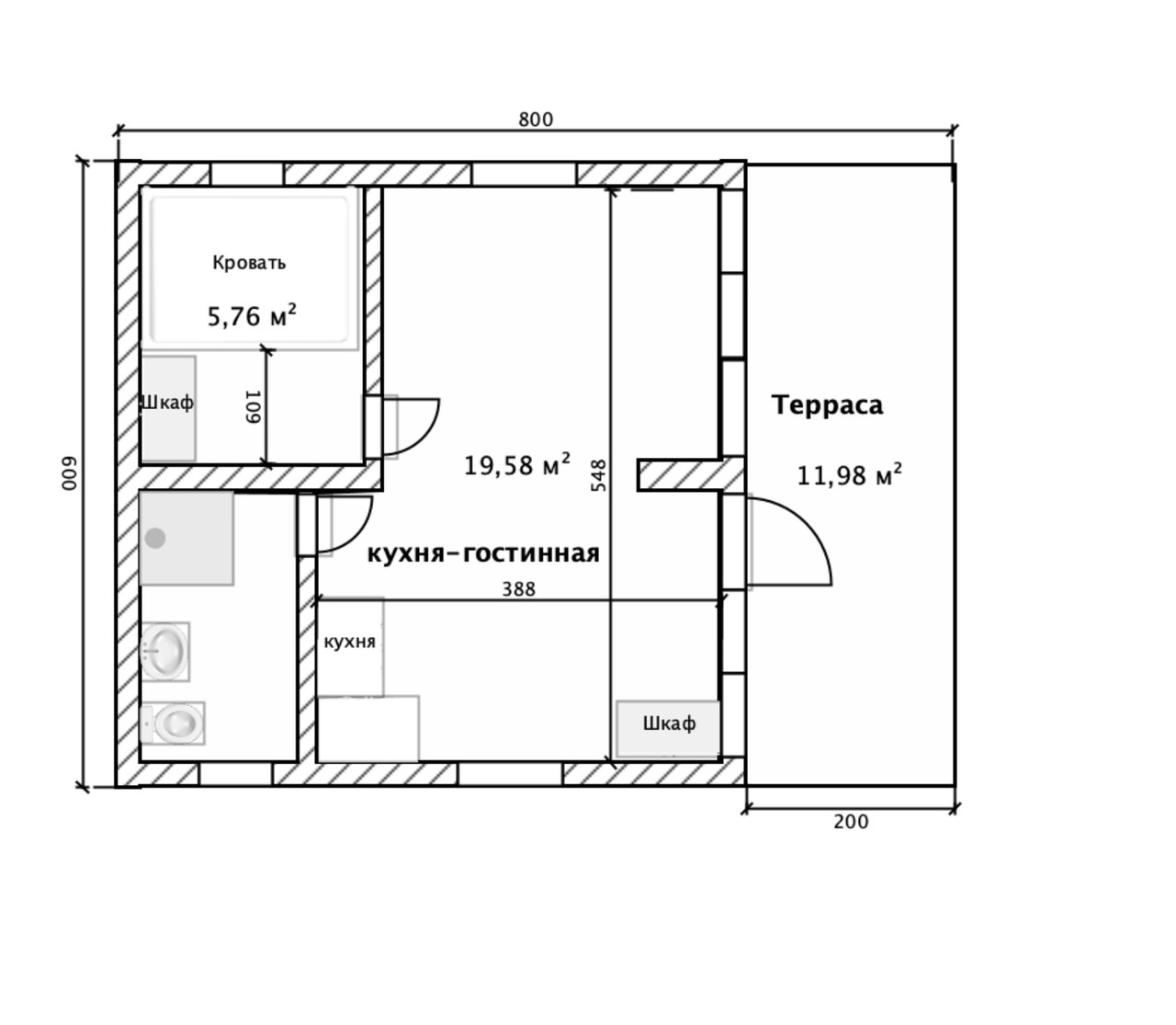 Общая площадь (включая террасу) 60 м2