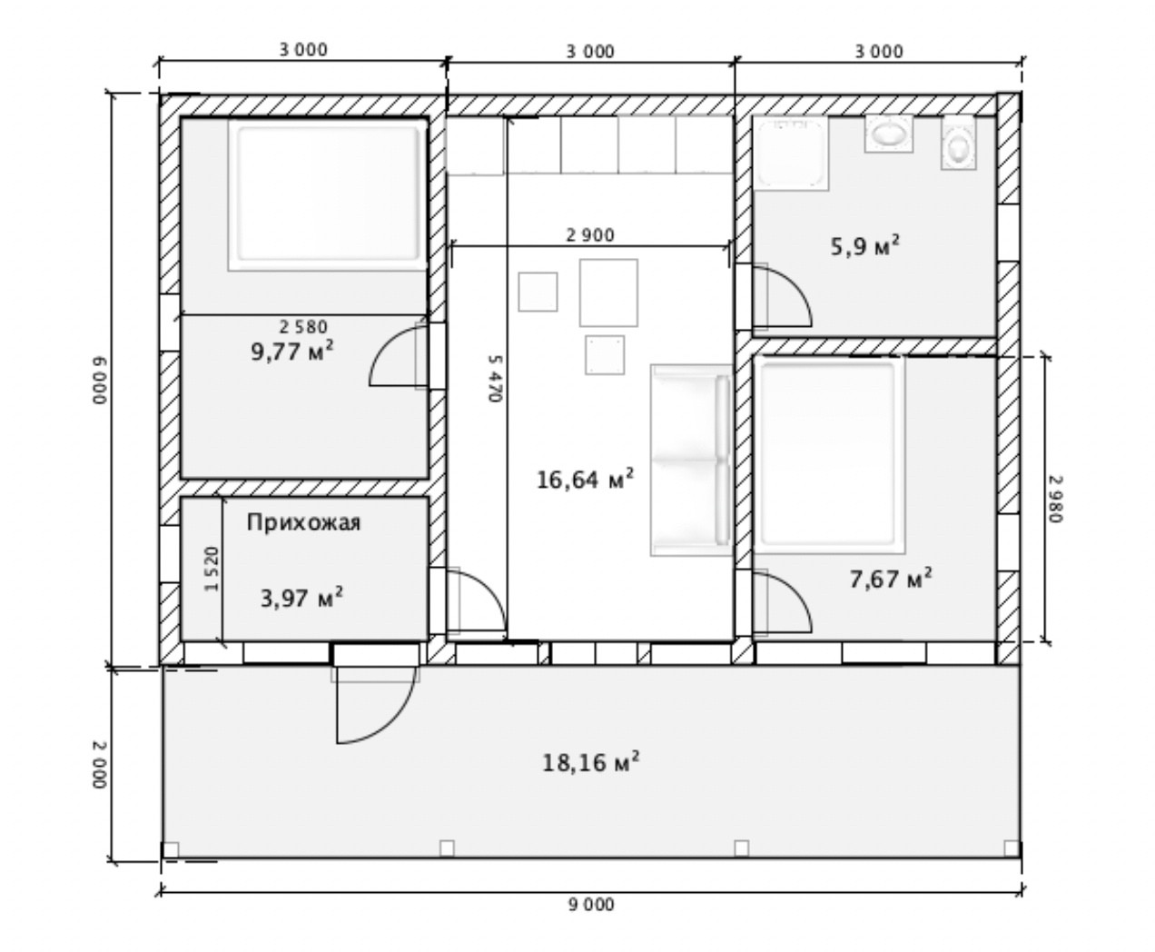 Общая площадь (включая террасу) 60 м2