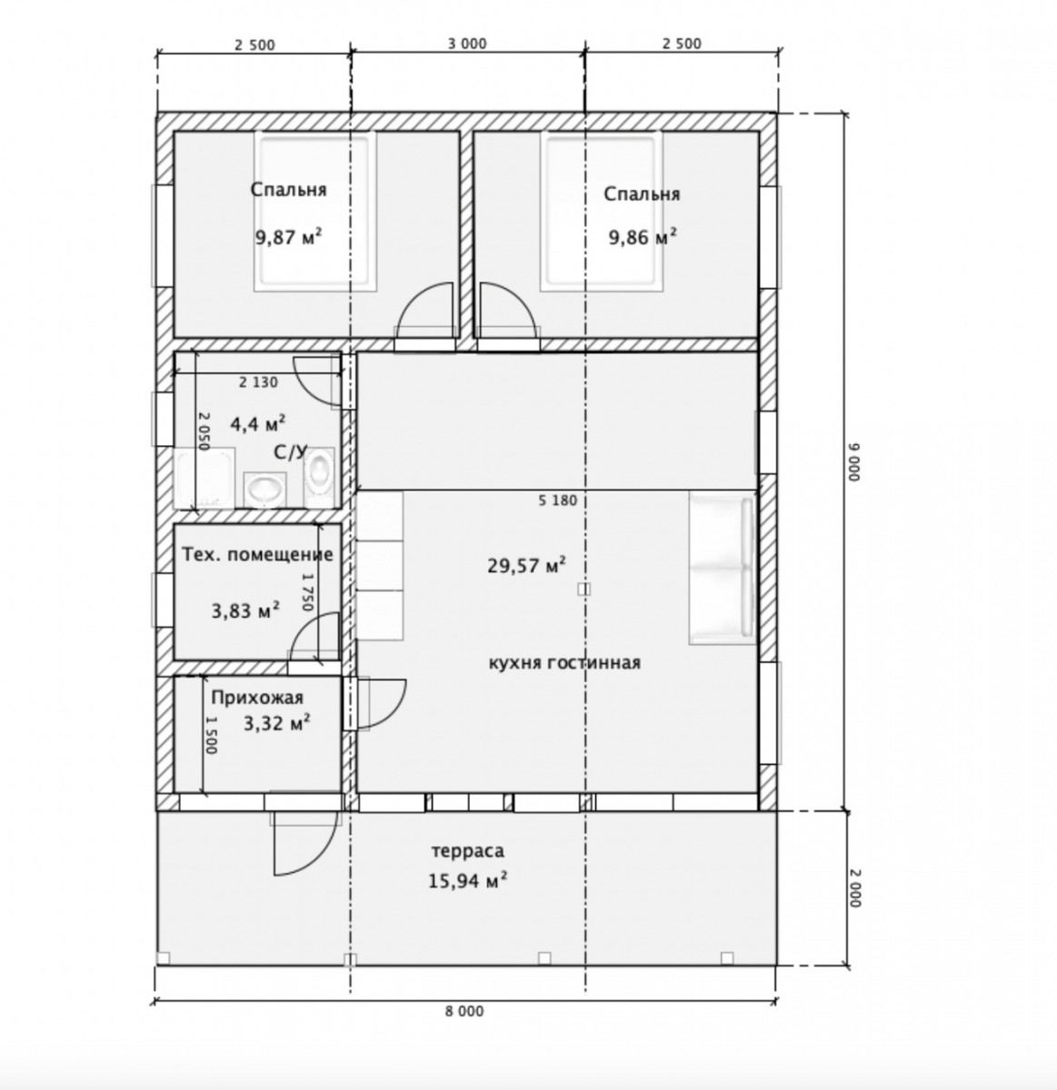 Общая площадь (включая террасу) 60 м2