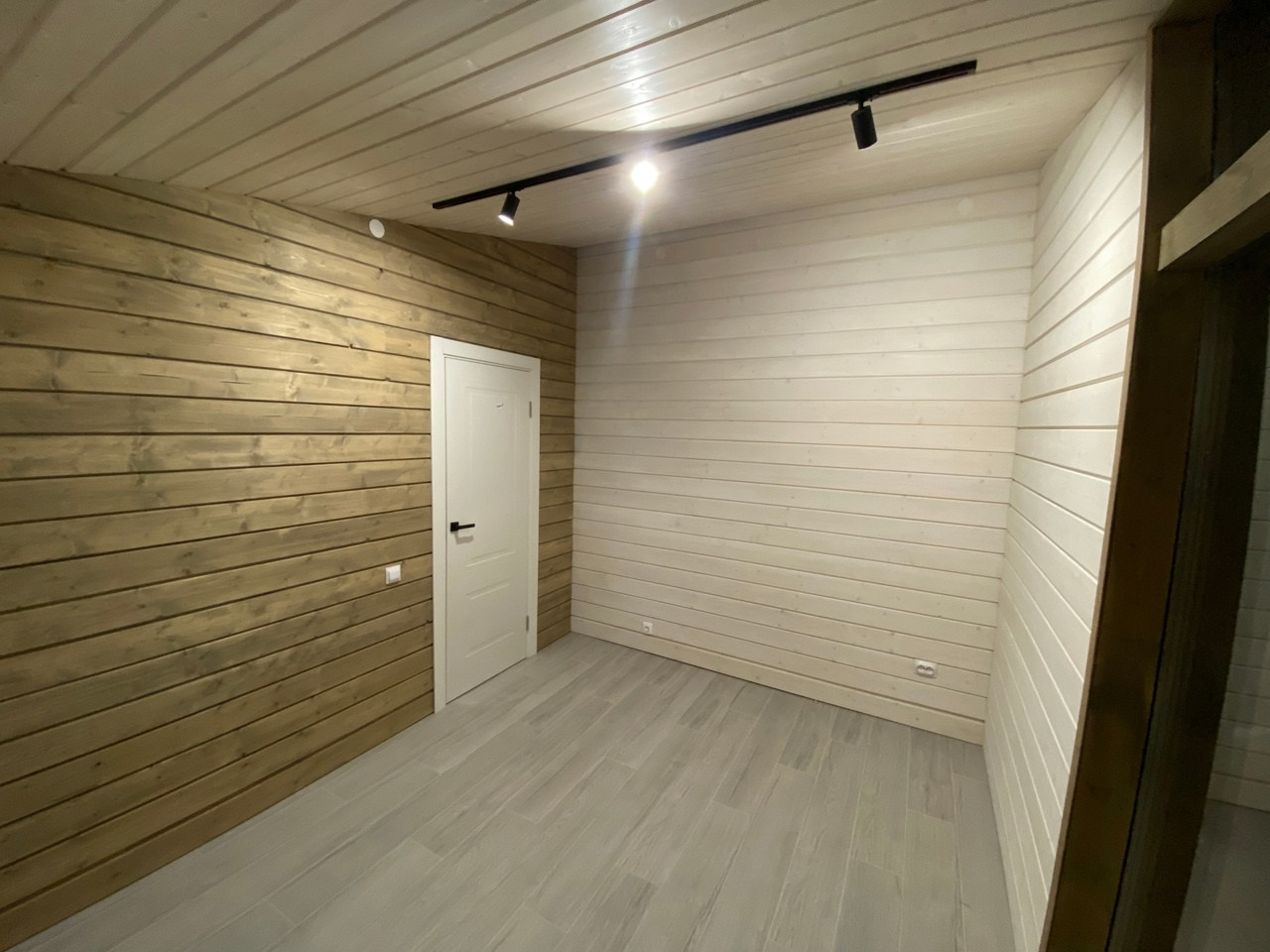 - Стены и потолок — имитация бруса карельского профиля (хвойные породы, сорт АБ, толщина 21 мм, окраска до монтажа)
