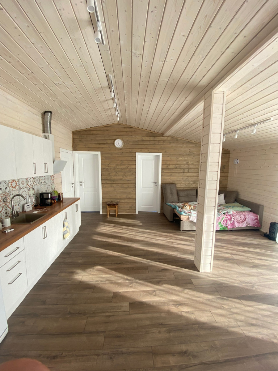 - Санузел: пол – кварцвинил, стены и потолок – имитация бруса, вентилятор с датчиком влажности