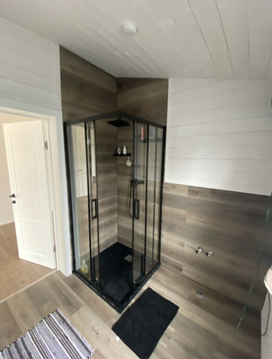 - Санузел: пол – кварцвинил, стены и потолок – имитация бруса, вентилятор с датчиком влажности