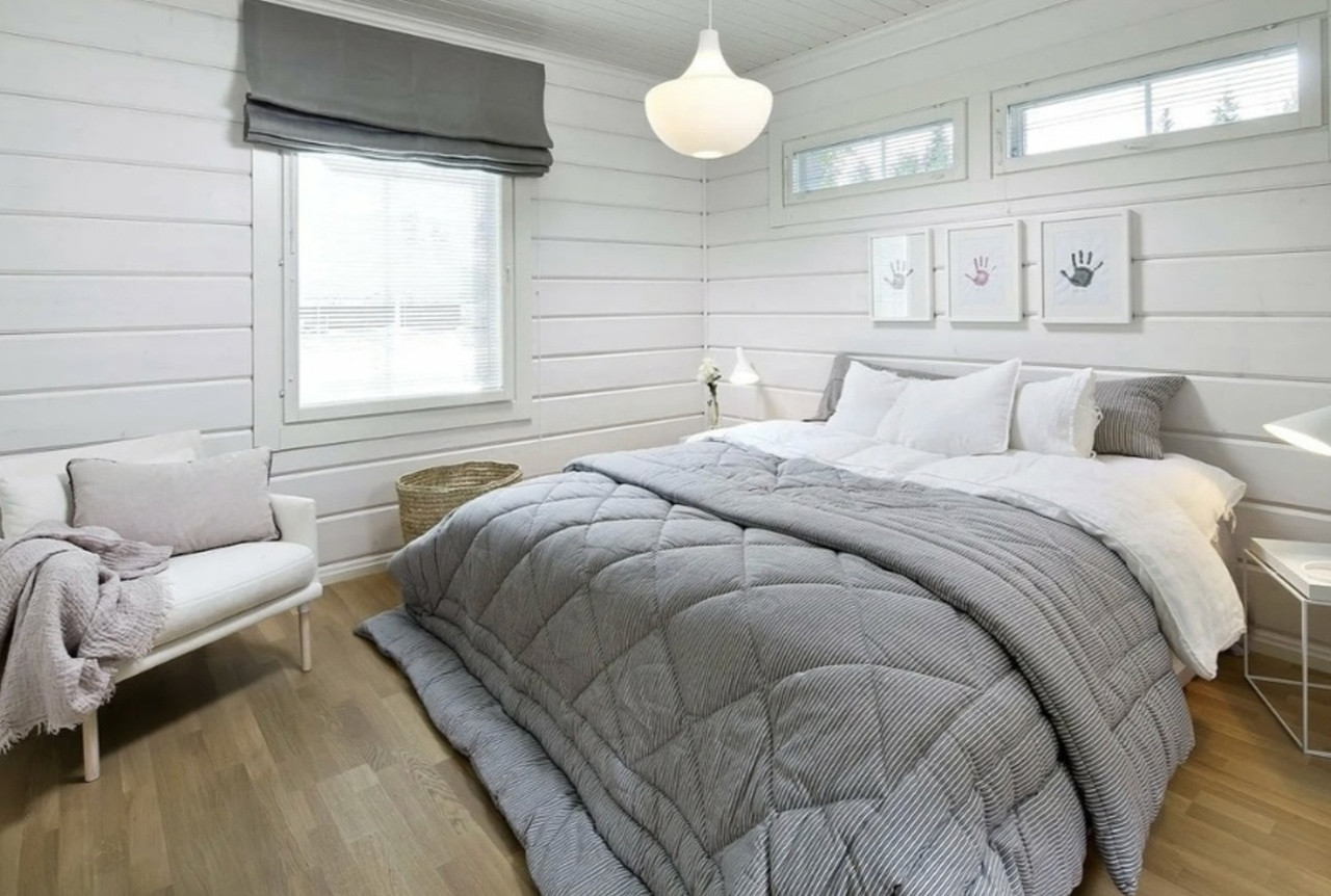 - Стены и потолок — имитация бруса карельского профиля (хвойные породы, сорт АБ, толщина 21 мм, окраска до монтажа)