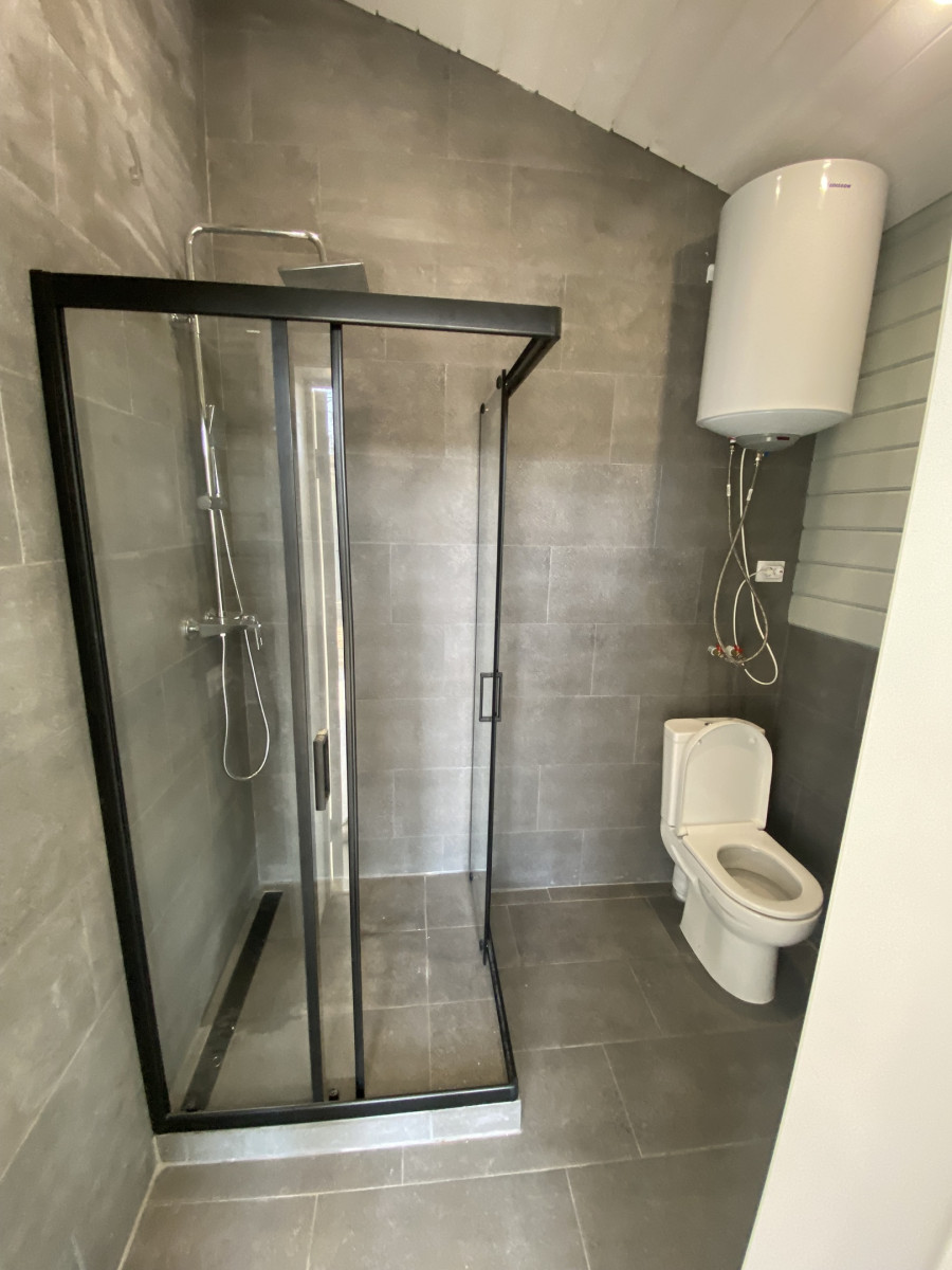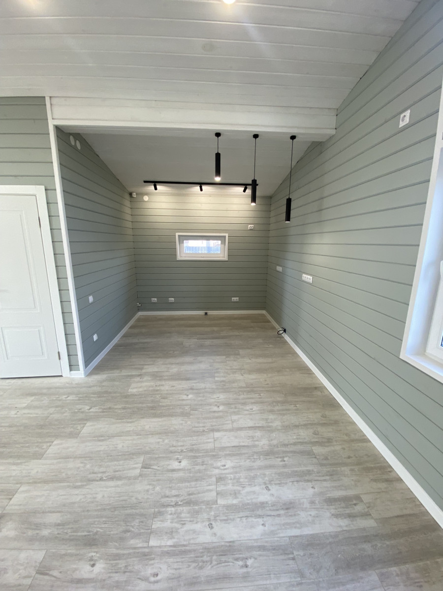- Санузел: пол – кварцвинил, стены и потолок – имитация бруса, вентилятор с датчиком влажности