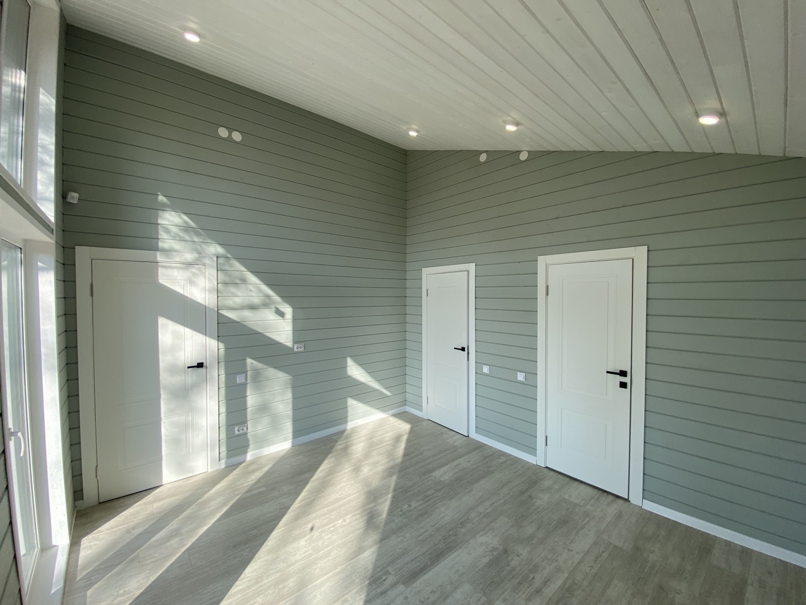 - Стены и потолок — имитация бруса карельского профиля (хвойные породы, сорт АБ, толщина 21 мм, окраска до монтажа)