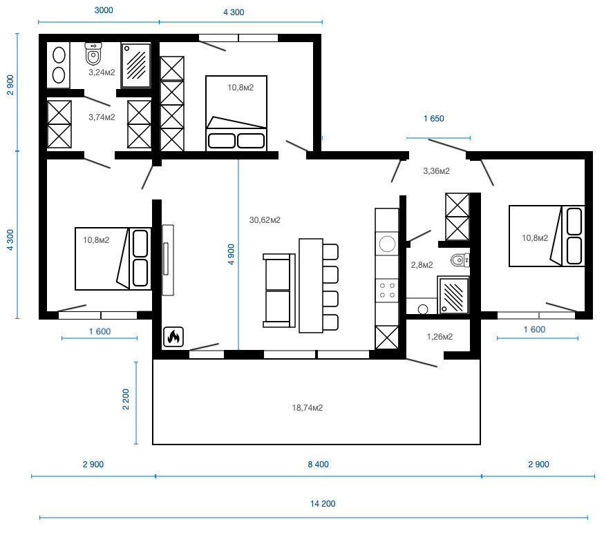 Планировка дома с 2 санузлами, гардеробом и 3 спальнями
