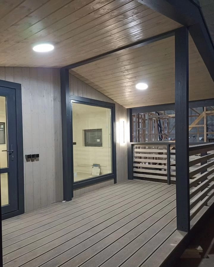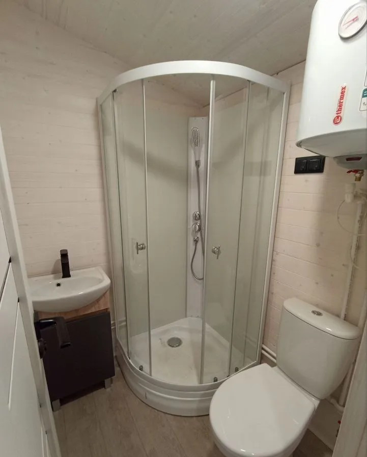 Когда я увидел дом в оочую, я был приятно шокирован, как внутренними размерами (7х3) в которую поместился С/У и приличная прихожая, так и видом снаружи.. В отличии от стандартных решений различных компаний, - то, что они предлагают на бумаге и фотографиях это одно, а сравнивая размеры внутри - совершенно другая история. Проходящие мимо соседи завистно смотрели и поздравляли, что придавало уверенности в том, что не прогадали и поступили правильно. Хотя и без их похвалы всё было для нас понятно.